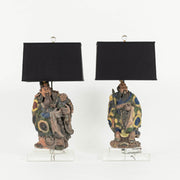 A pair of 19th Century Meiji Japanese Sumida Gawa figural pottery lamps. Early pieces were made with exaggerated features and very detailed earthenware. Manufacturing was popular between 1890 - 1920 where many were made for export.