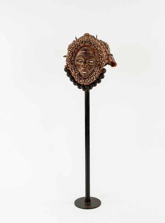20th Century hand carved Dan mask with cowrie shell and raffia headdress on custom table stand.