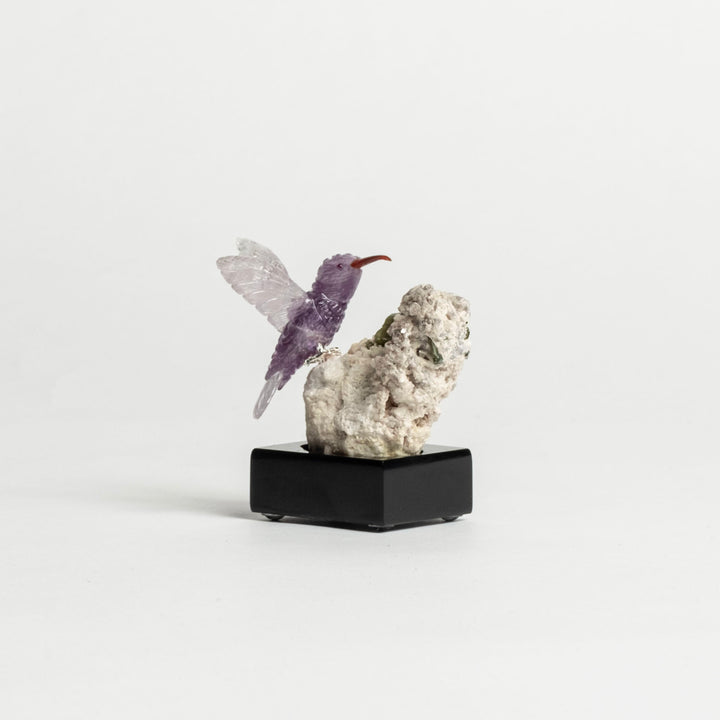 Amethyst Humming Bird on White Granite and Tourmaline Base