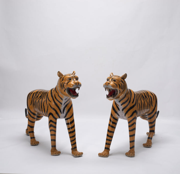 A stunning pair of 20th century life-size Chinese cloisonné tigers from the Baron Estate. In Chinese symbolism, these tigers represents the masculine principle in nature and is king of all the animals, as shown by the four stripes on his forehead, which form the character Wang. The tiger represents the greatest earthly power, as well as protection over human life.