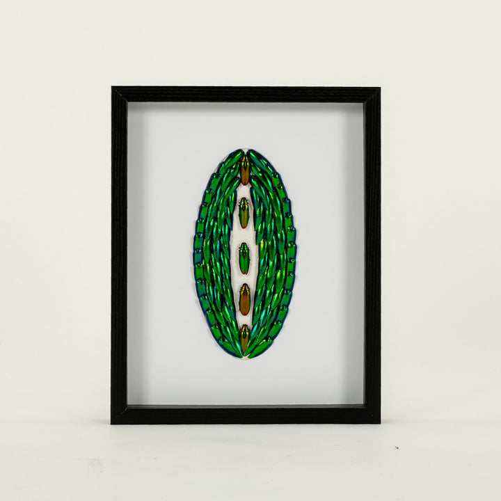 Artful composition of Emerald Jewell beetles in contemporary black frame.