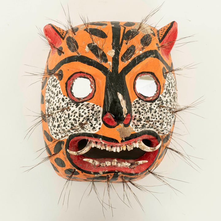 Hand painted Indonesian papier-mâché tiger wall mask with wild boar tusks, teeth and hair. Orange, black and white in coloring.
