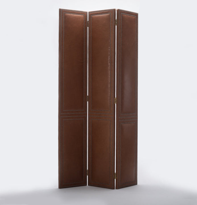 Custom three panel cognac leather screen with nailhead detail, floor sample as is.