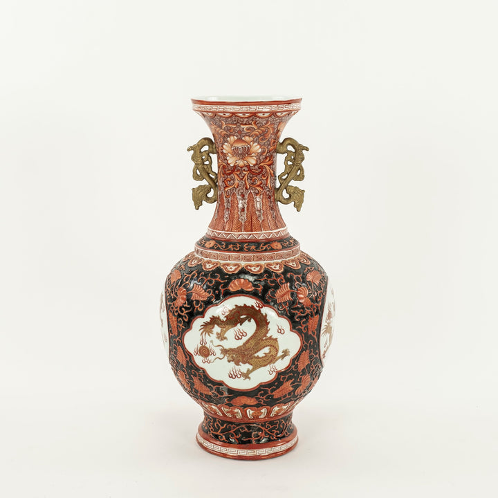 Chinese hu vase decorated with gold and orange dragons, floral and foliage base-relief embellishments.
