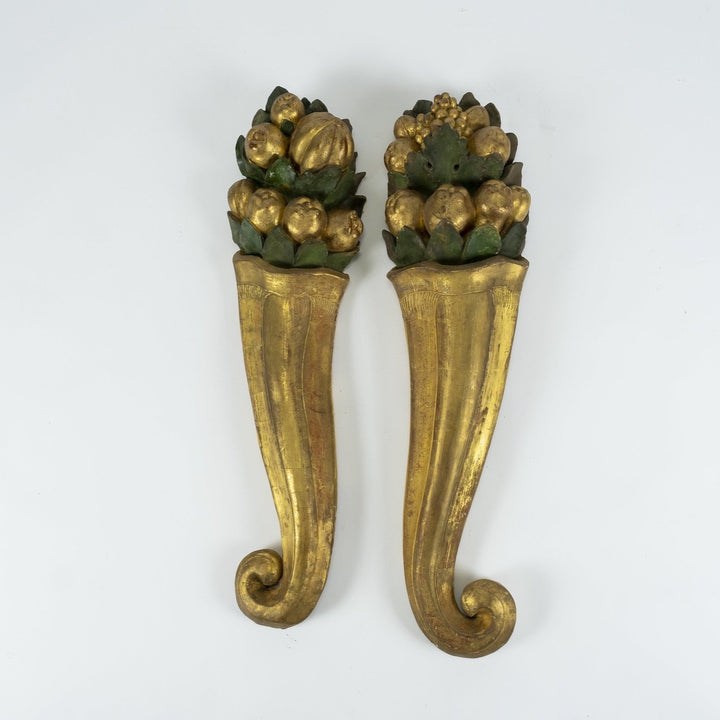 Pair of 18th century French patinated and gilt wood cornucopia.
