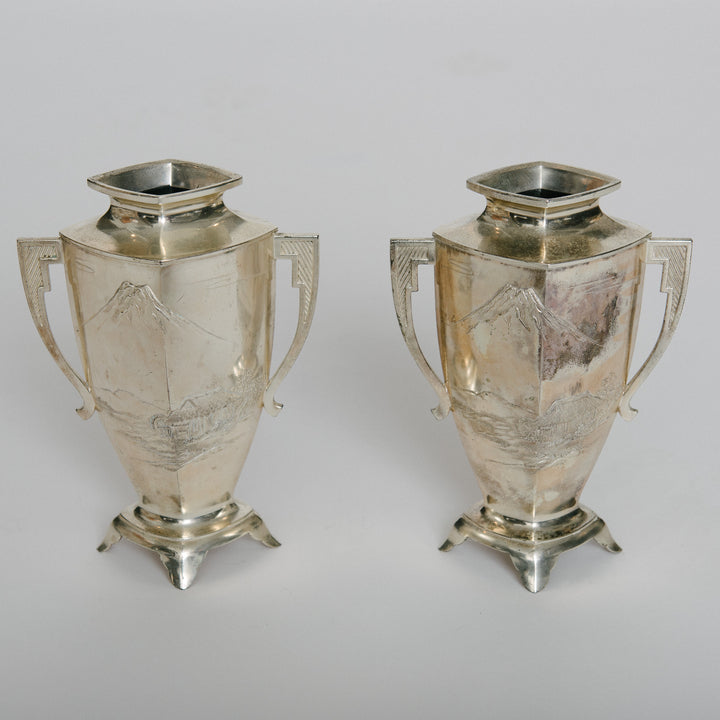 Pair 1940s Art Deco Aesthetic Silver Vases