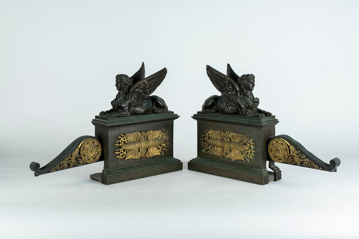 Pair of Antique French Empire Bronze Sphinx Chenets
