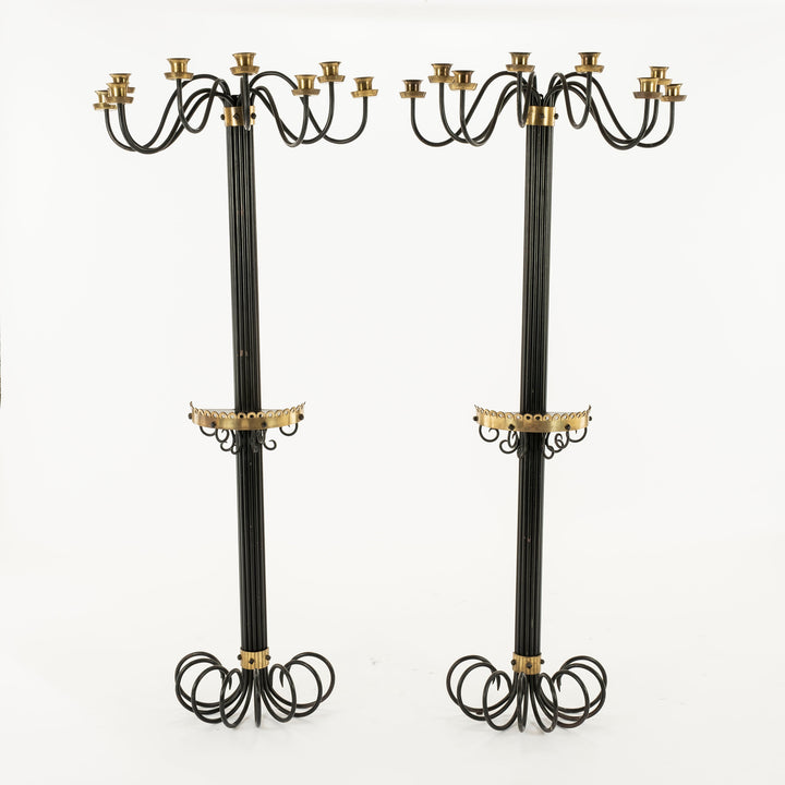 Tall Pair Iron and Brass Standing Wall Mount Candelabra Sconces