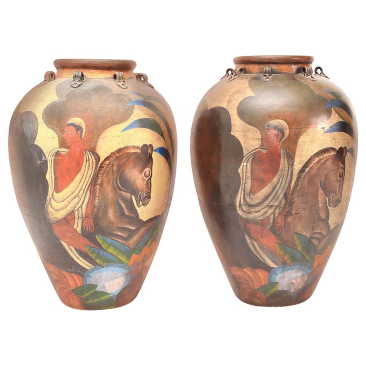 Pair Of Painted Deco Style Antique Terra-Cotta Amphora Jars