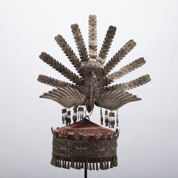 Peacock & Phoenix silver filigree opera hat on iron stand. Claret silk velvet hat.