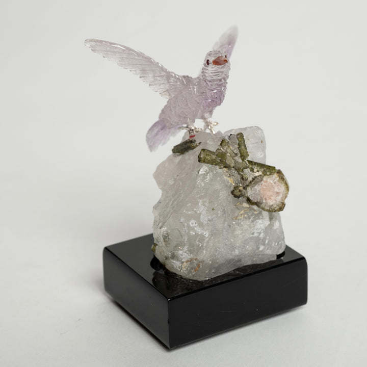 Pink Quartz Hummingbird on Tourmaline and Quartz Base