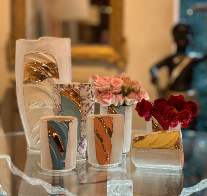 Limited Edition Patisse Chase Gamblin hand built 24k fireglazed tumbler vase cups. These luxe organic beauties can hold your favorite morning cup of coffee or tea and double as a pretty vase or catch all. Select your favorite from image six before they're all sold out!
