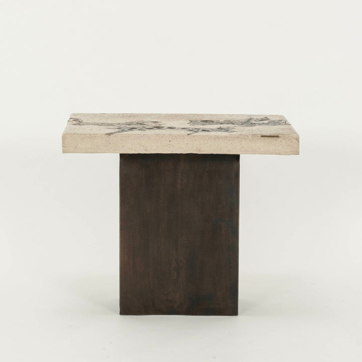 Signed by the artist, this side table was created using an acid wash to treat the stone. Then, molten bronze was poured on and allowed to settle and solidify in the natural dips of the stone. The sudden temperature clash caused by the heat of the molten bronze meeting the cold stone results in a beautiful patina on the bronze.