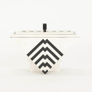 Inverted Triangle tessellated travertine stone box featuring black marble and black cloth interior lining.