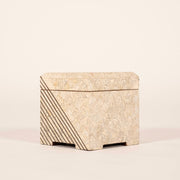 Wood frame, cloth-lined interior and bottom, travertine, brass inlay.