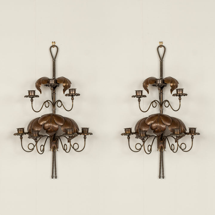 Pair Italian Hollywood Regency Brass Plume Candle Sconces