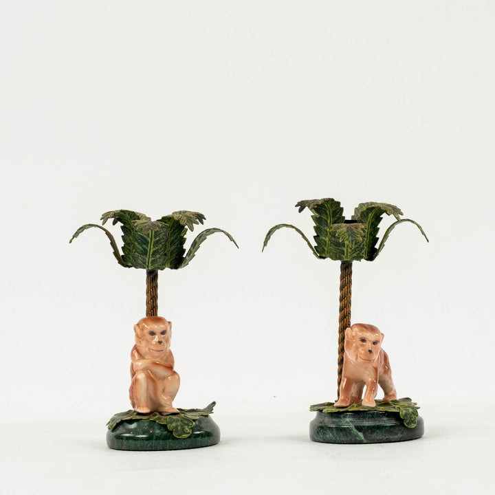 Pair Vintage Tole Monkey Palm Tree Candlesticks