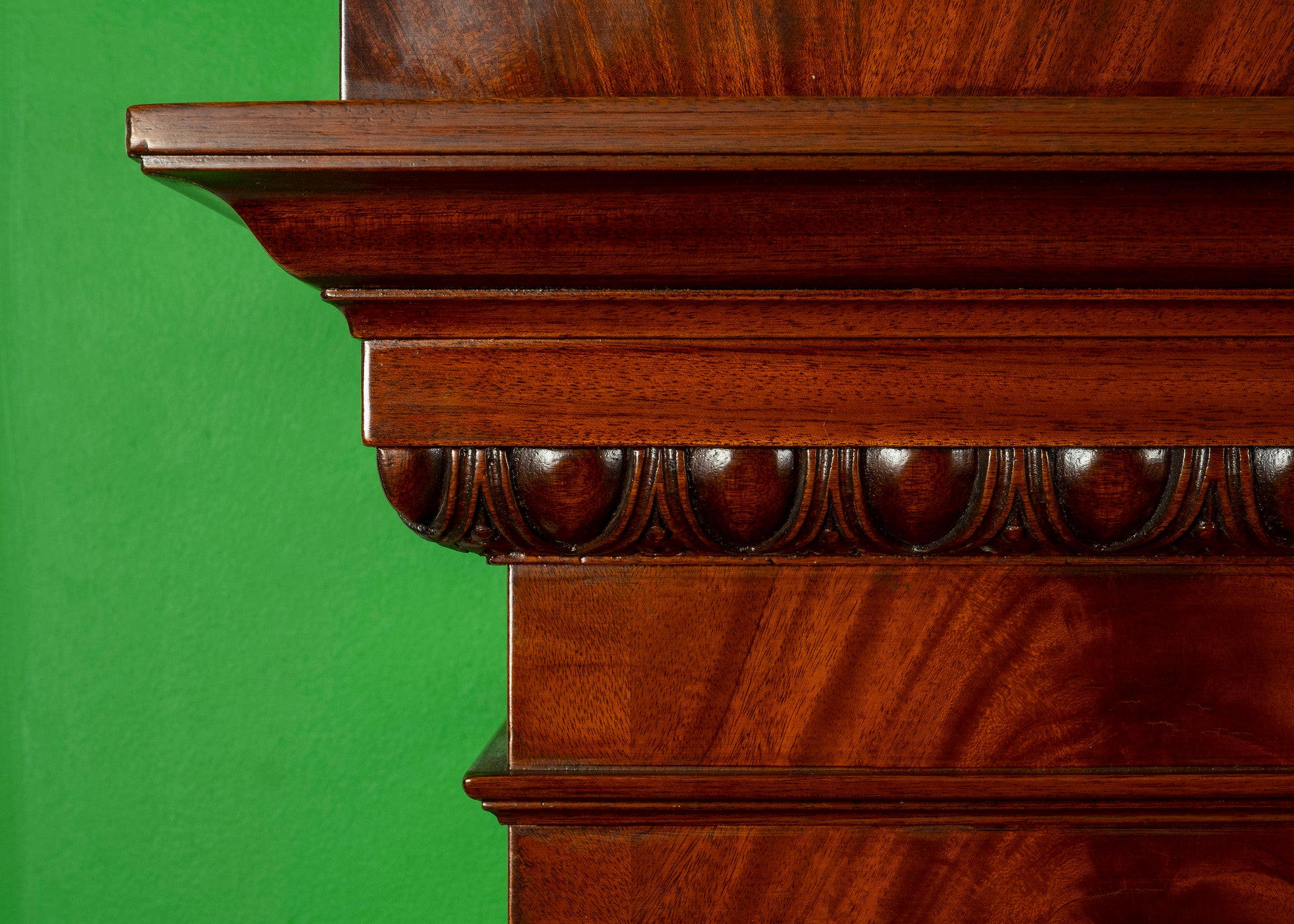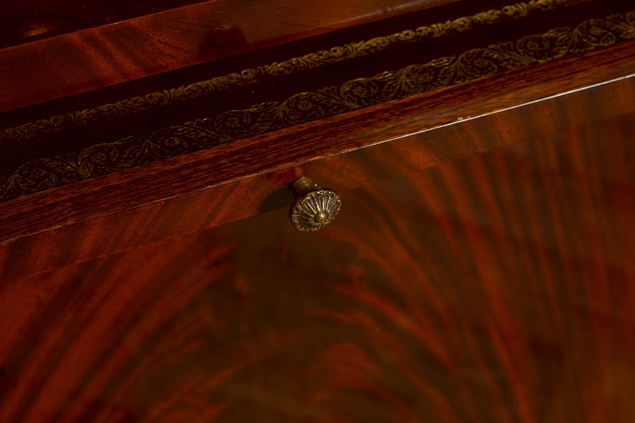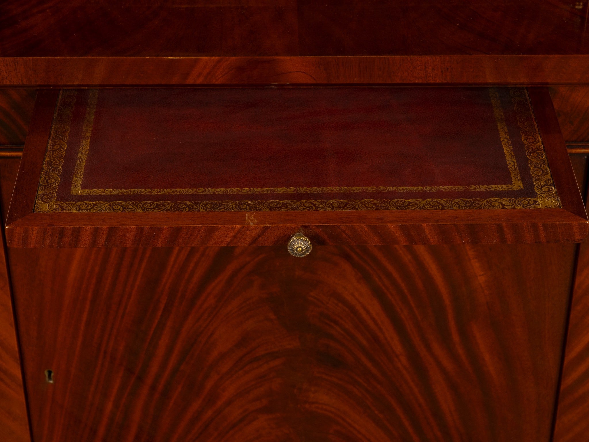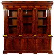 A handsome Italian George III flame mahogany bookcase with three upper glass door cabinets, adjustable shelves, three base cabinet doors with three pullout or pull-out shelves and gold giltwood column detailing.