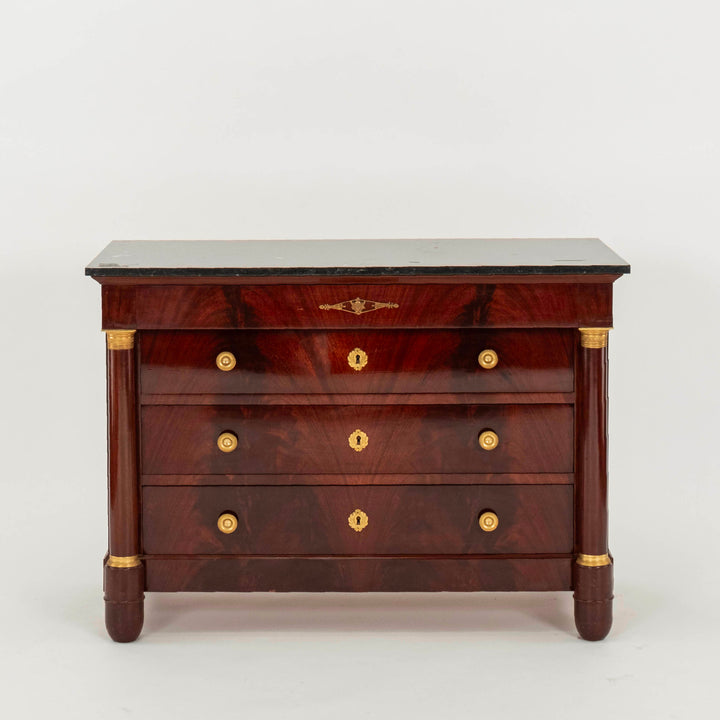 Flame Mahogany, gilt bronze ormolu, black marble top.