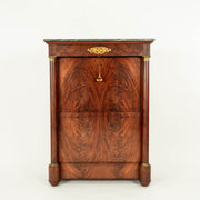 French first Empire period Secretaire à Abattant, also known as a drop-front secretary, fall front or cantilevered desk. The cabinet is flanked by columns adorned with finely cast bases and etched bronze capitals. Under the dark grey marble top is a secret, entablature drawer. The front opens to reveal several drawers, a column theatre and a writing surface. More compartments are hidden behind the columns and drawers. The base of the cabinet features two doors and shelf.