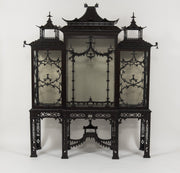 Stunning and rare 19th Century English Chinese Chippendale style pagoda cabinet. This highly stylized hand-carved mahogany cabinet features pagoda gabled roofs, classic Chippendale fret work, and branch vined glazing bars in a trellis pattern that adorn the doors.