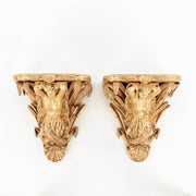 An exceptional detailed pair of mid-18th century George III giltwood wall shelves featuring mermaids with long flowing hair, spikes of cattails, shell cartouches and fish border along edge.