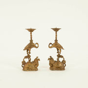 Pair of brass candlesticks depicting crane perched on top of a stylized tortoise.