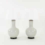 Pair of hand-thrown porcelain lamps with antique brass hardware and black lacquer base.