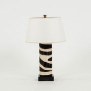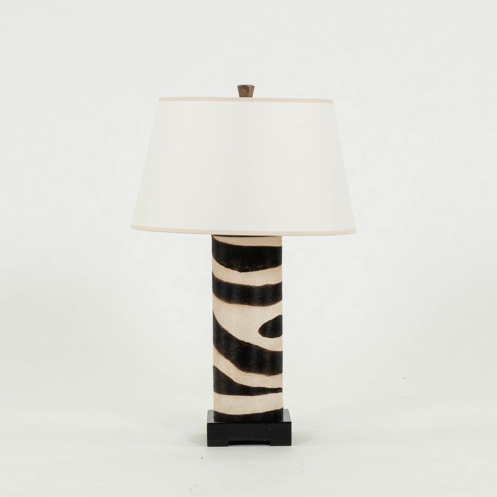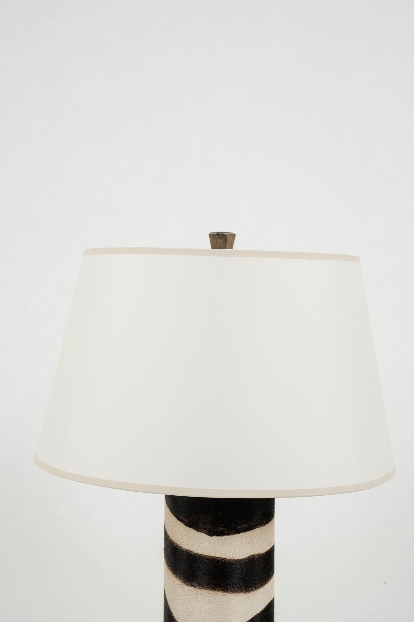 Cow hide with zebra print, ebonized wood base, white paper shade.