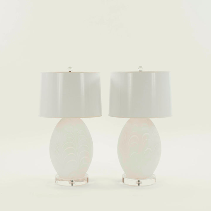 Vintage pair of white swirled and frosted Murano egg shaped glass on lucite base table lamps shown with white paper shades. Newly electrified.