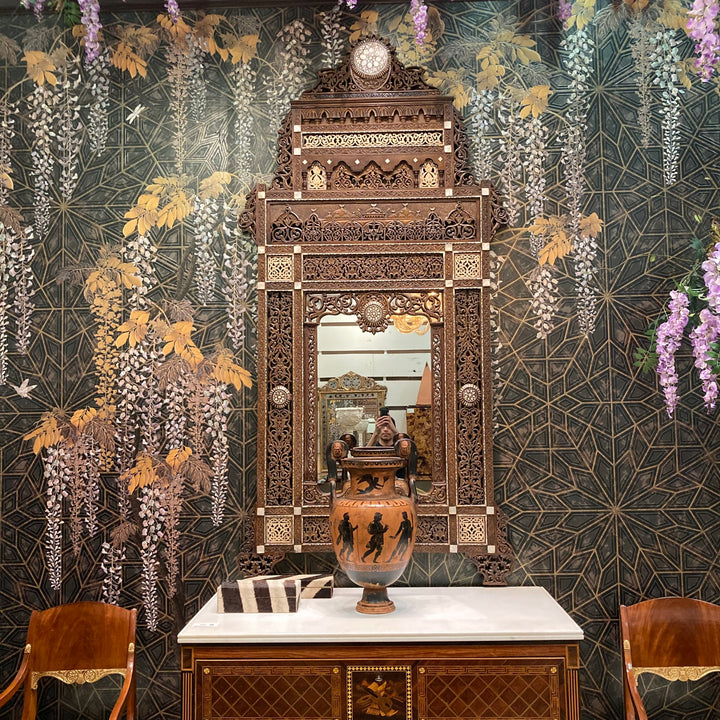 Carved wood, mirror, bone inlay, and mother-of-pearl inlay.