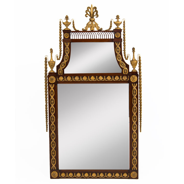 Mahogany frame with gilded rosettes, delicate beading, classical urns and mirror.