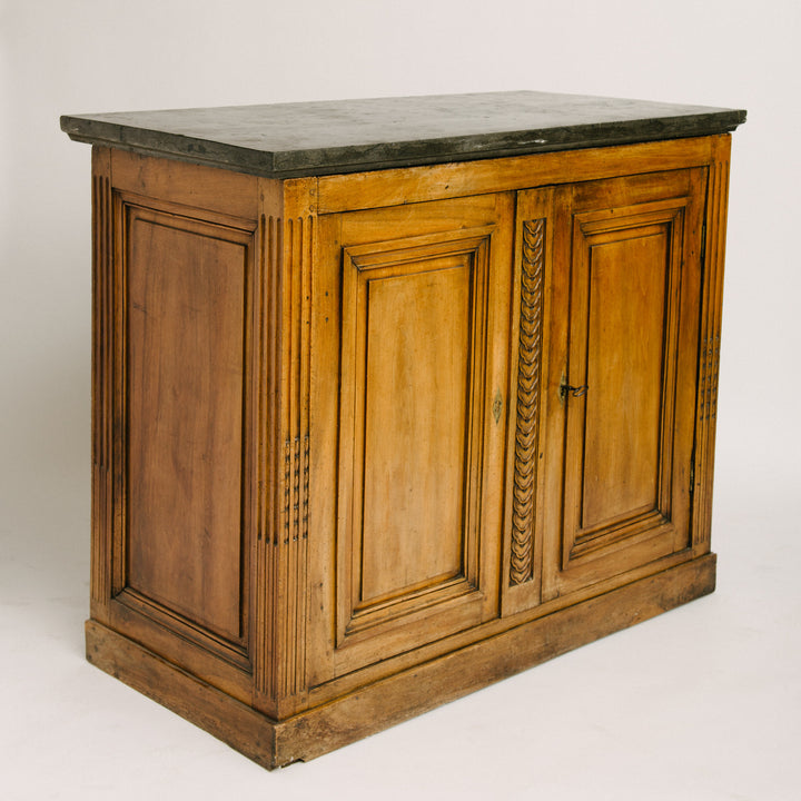 18th Century French Louis XVI carved walnut buffet with original stone top.