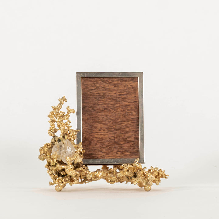 Gilt bronze, quartz mineral specimen, wood.