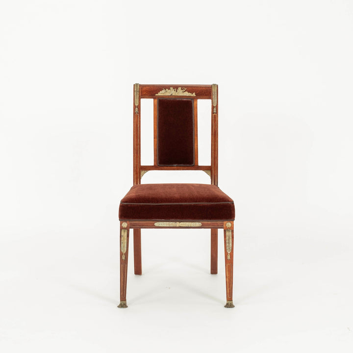 Mahogany, brass inlay, ormolu, brandy mohair with leather trim.