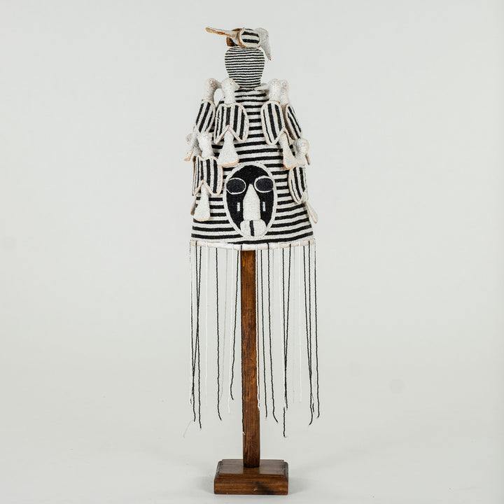A beautifully handmade African beaded ceremonial mask by the Yoruba People, Nigeria. Bird and face detail on wood stand.
