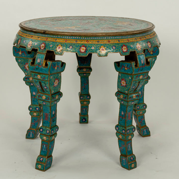 Early large 20th Century bronze Qing style cloisonné center table. Thisl large form table features extraordinary workmanship with stunningly rare Imperial colors and is heavily decorated with auspicious symbolism including happiness characters, foo dogs for protection, clouds for celestial mobility of the gods, flowers for purity, and rebirth of love and union.