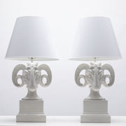Pair of white vintage ram's head lamps from the Hollywood Regency period.