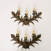 Pair of Italian hand-forged three-light gilt leaf sconces.