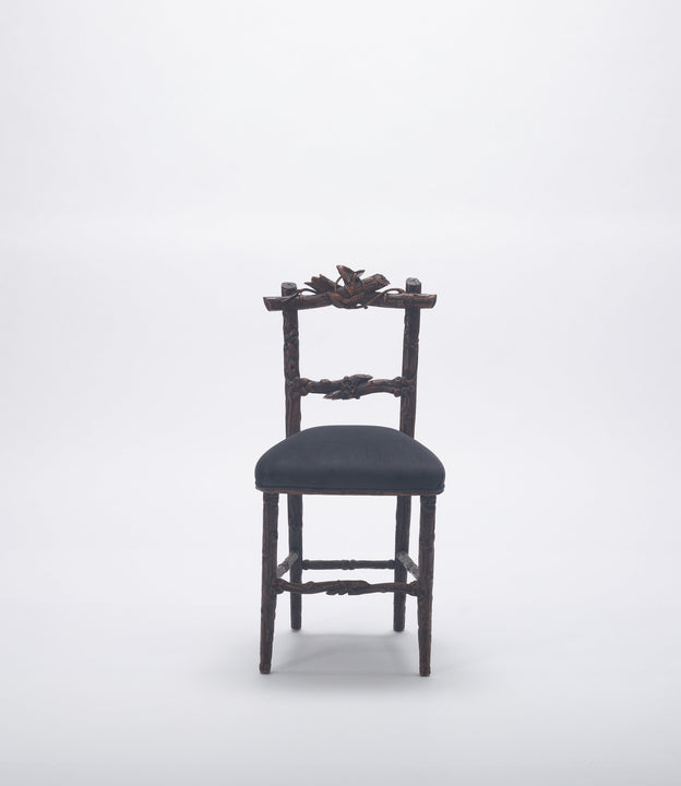 19th Century hand carved Black Forest chair newly upholstered in a charcoal velvet.