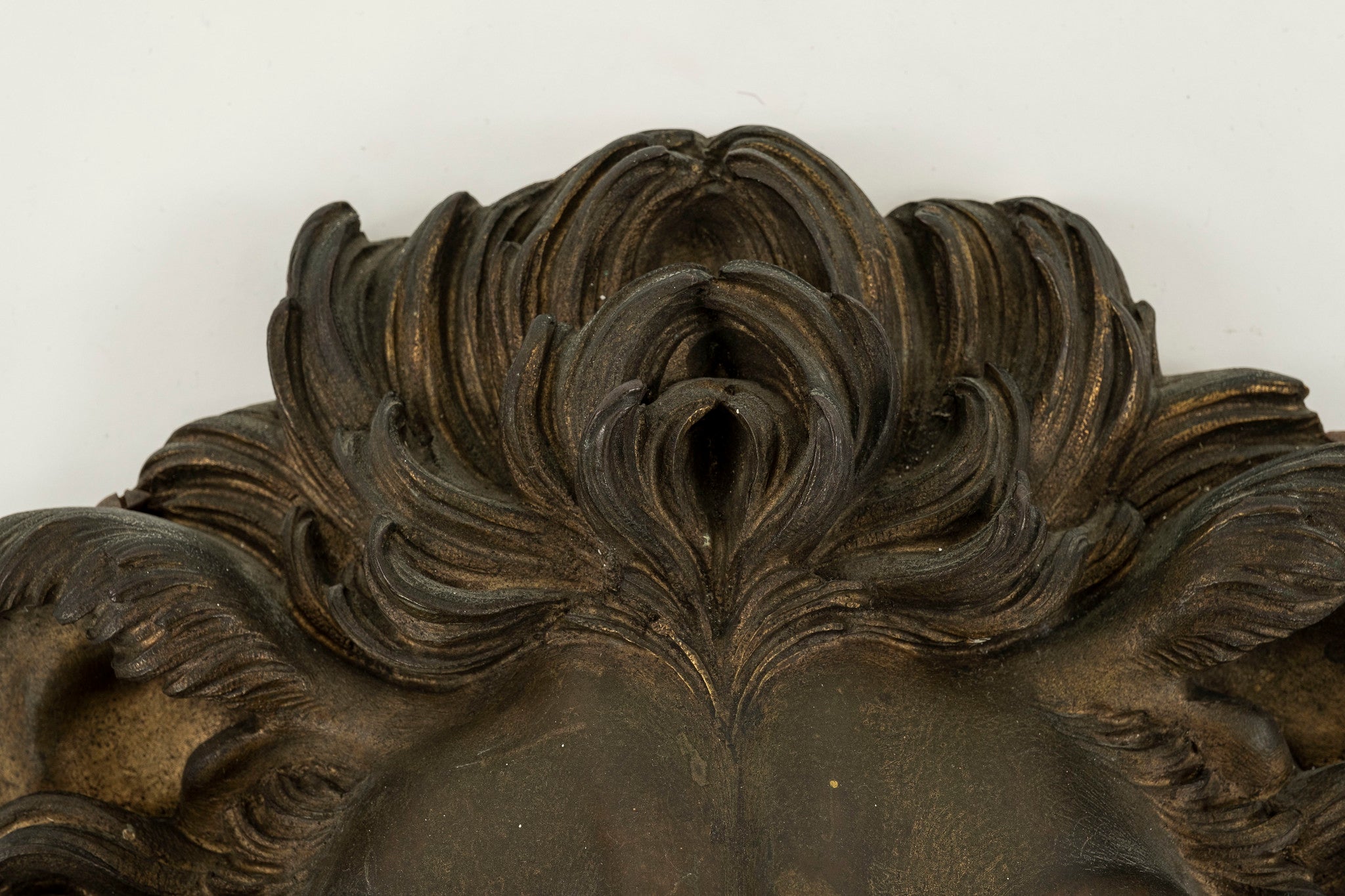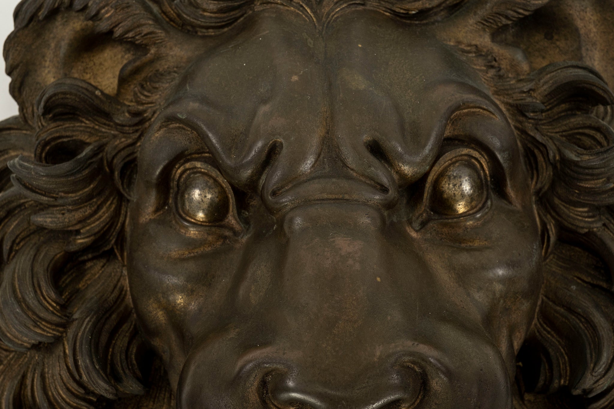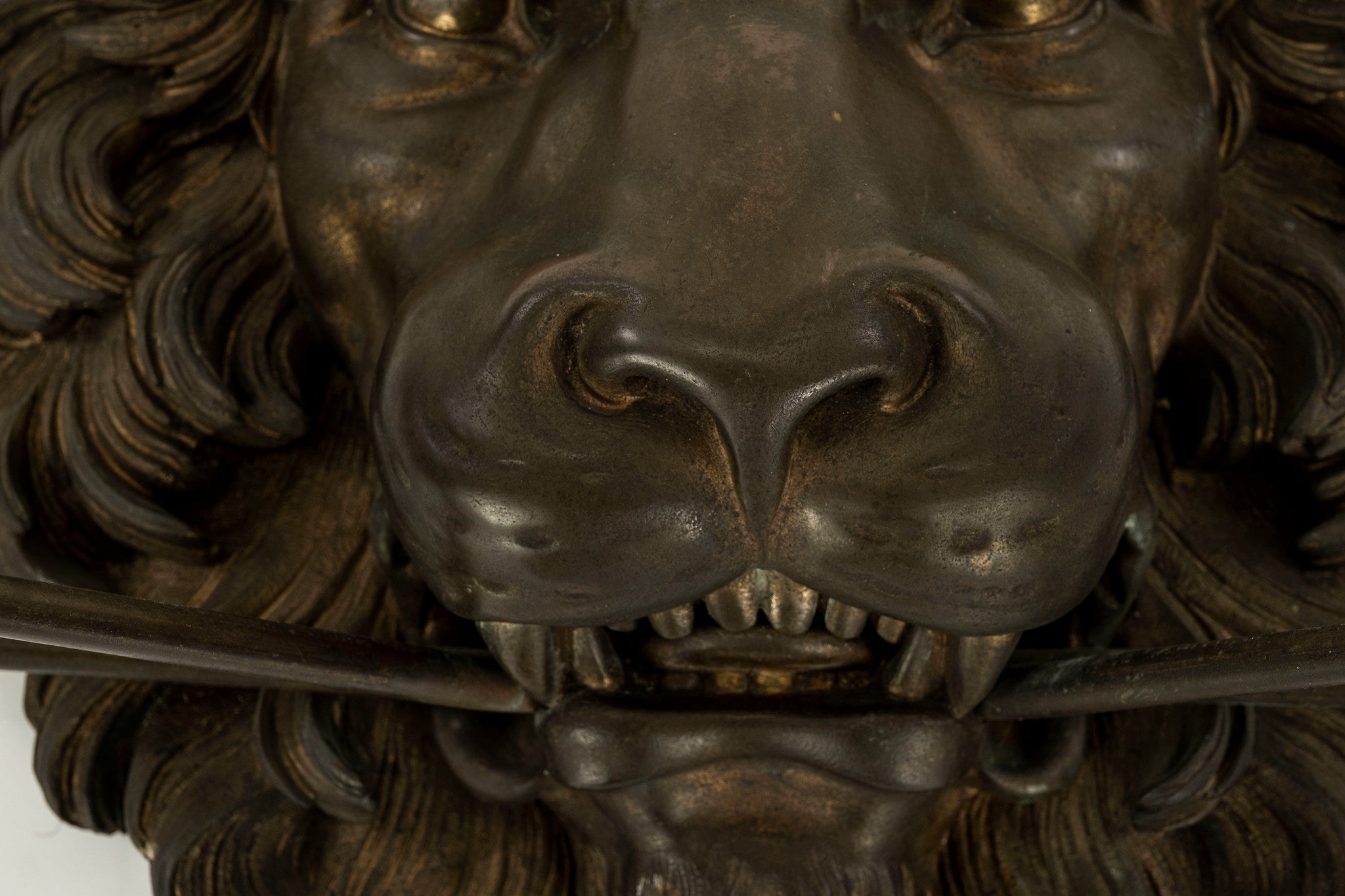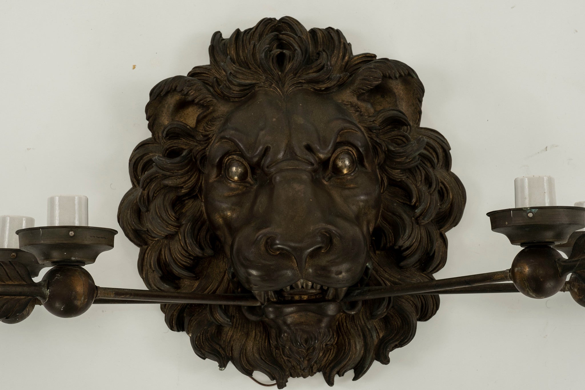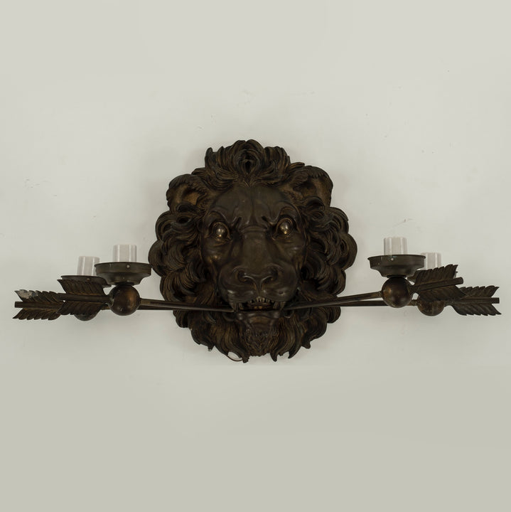 19th Century Neoclassical style four light wall sconce. This solid bronze sconce features a monumental lion's head gripping four arrow quivers in his bite.