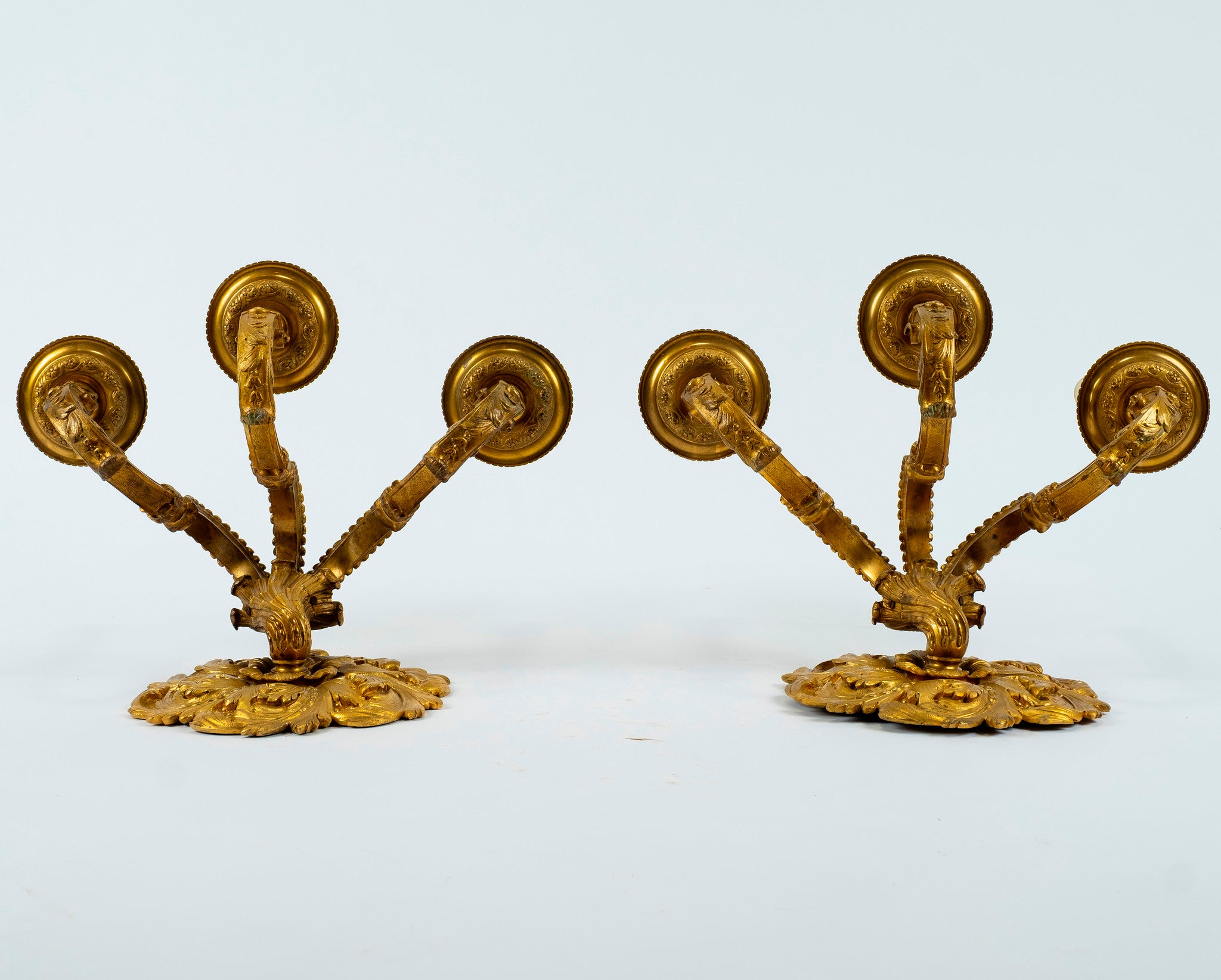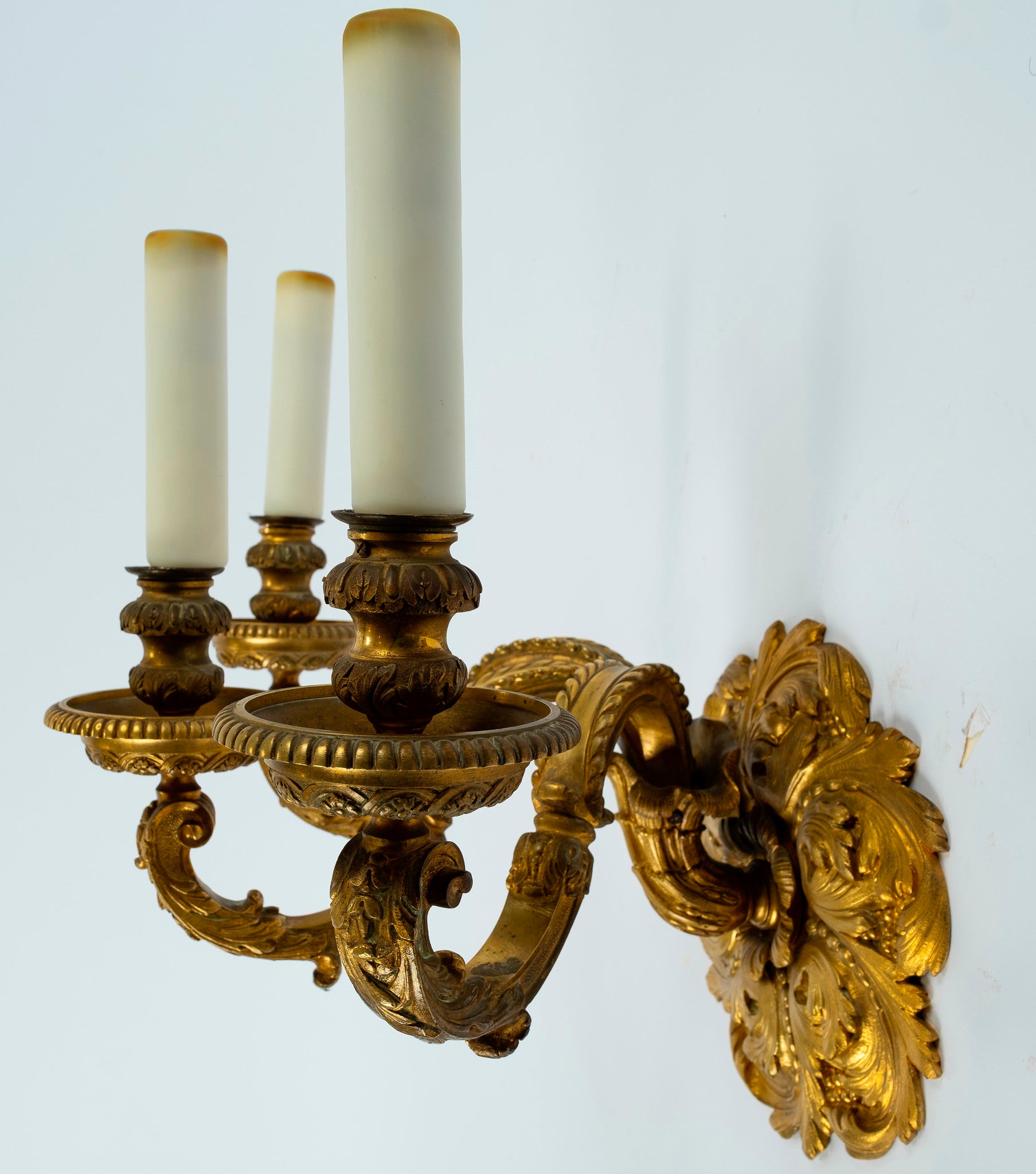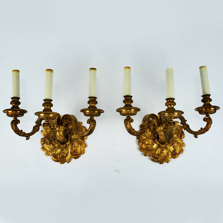Pair 19th Century Bronze D'ore Three Arm Sconces