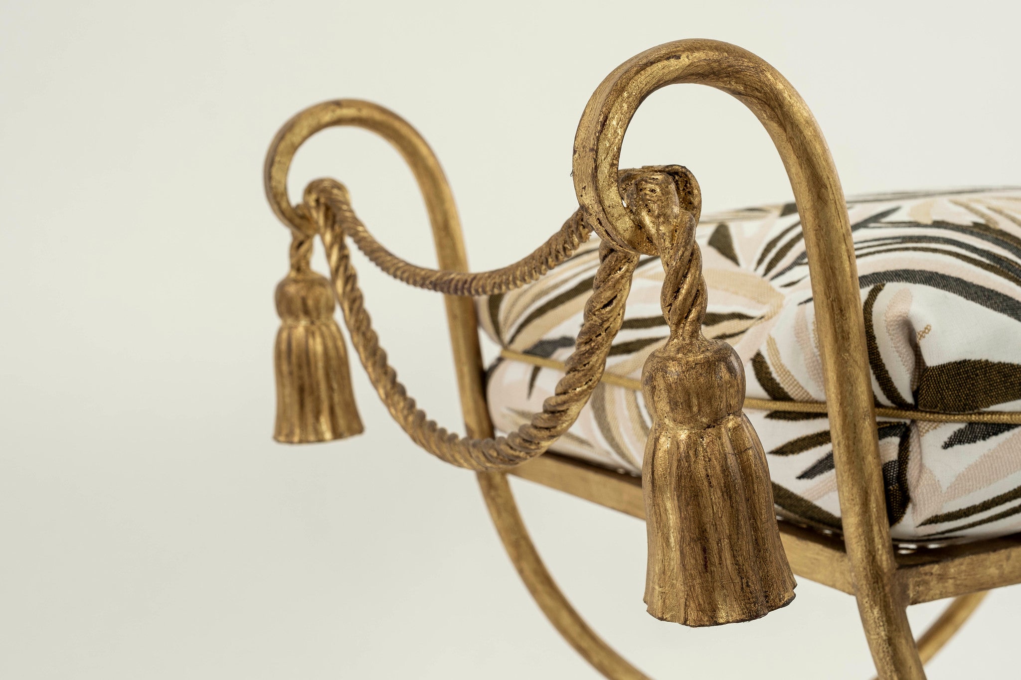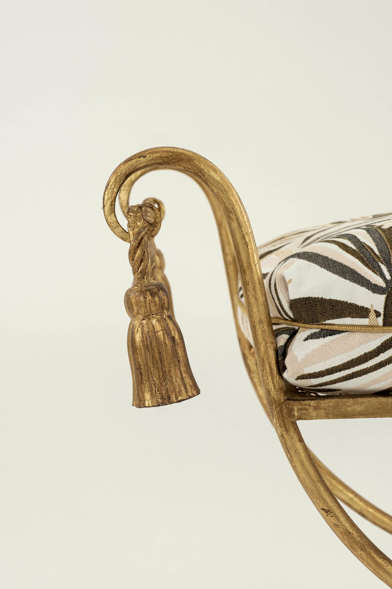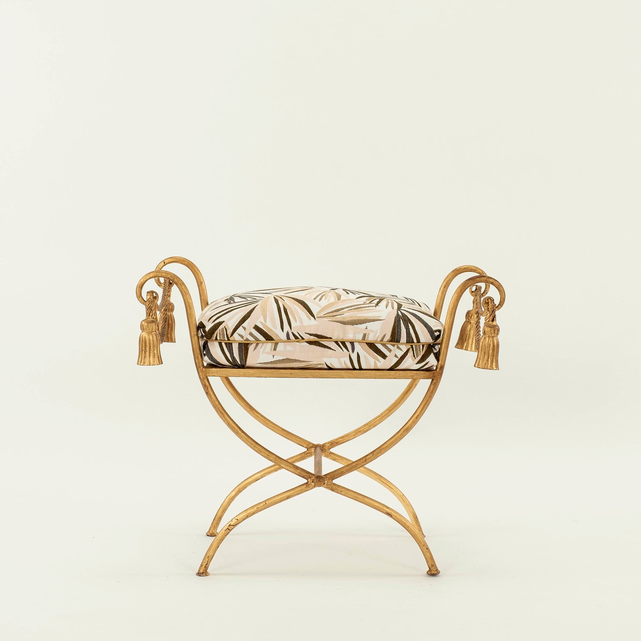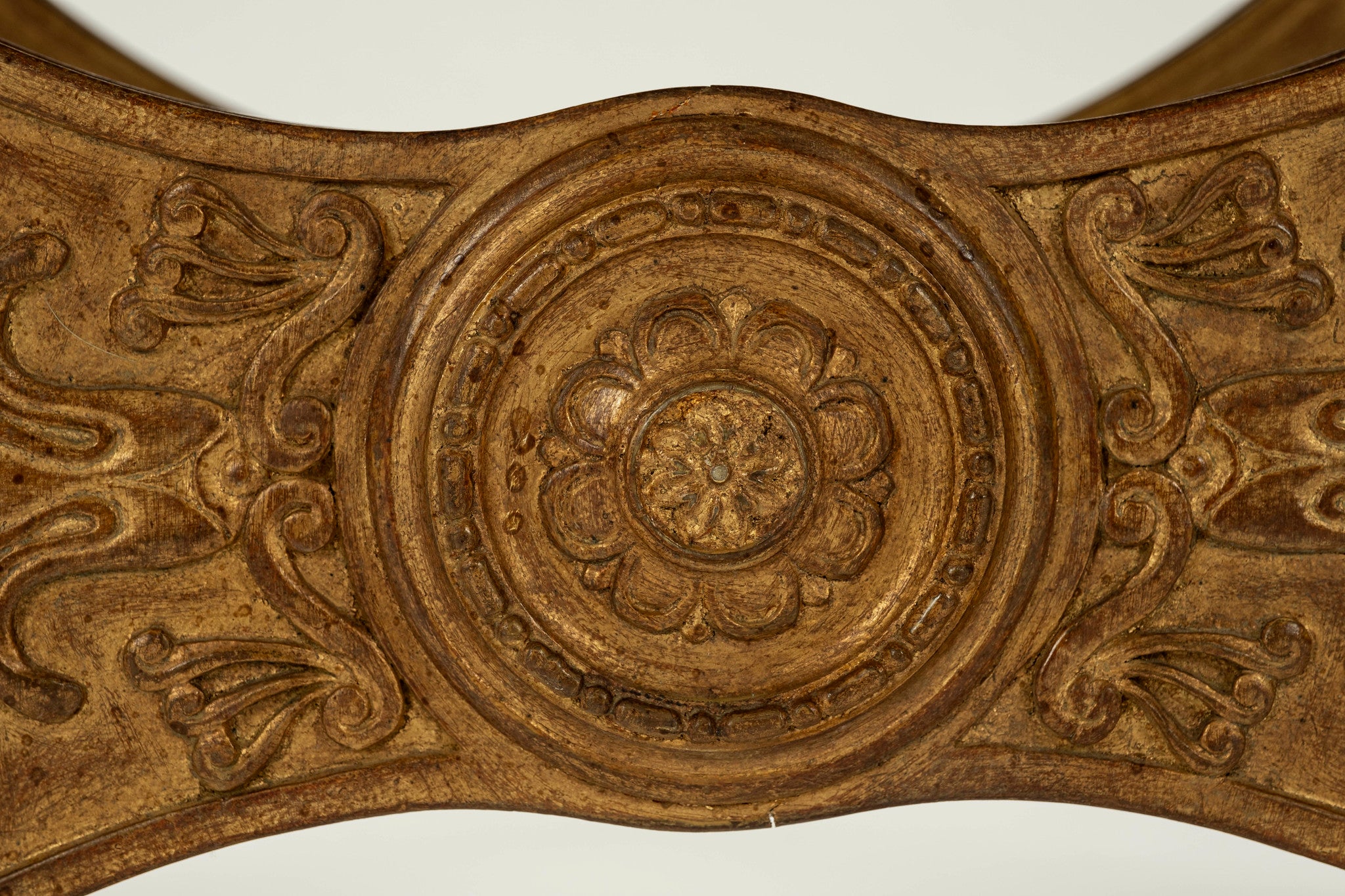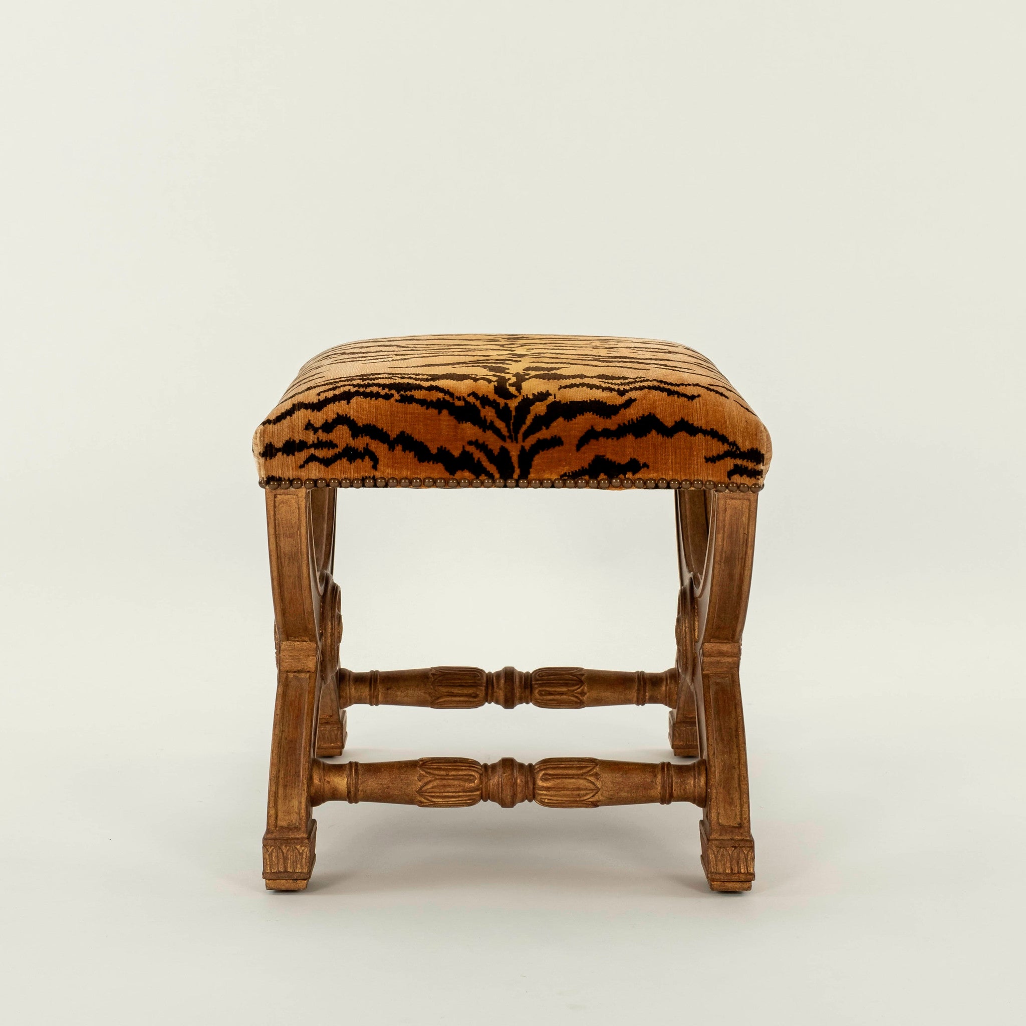 Vintage Regency style giltwood curule in tiger velvet. Condition: Sturdy wood frame in excellent vintage condition with surface wear consistent with age and use. Slight marring to cleaned velvet, no...