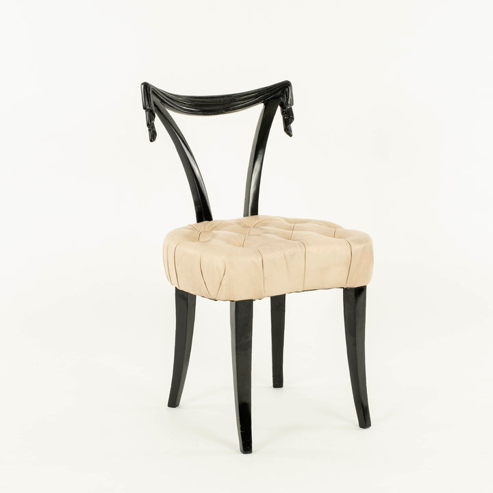Elegant Grosfeld House ebonized occasional chairs having open backs with dramatic hand-carved draped swags with button tufted leather seats. Sold individually.