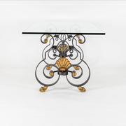 Vintage Louis XV style brass, iron and glass dining table. Heavy base is made of thick scrolled flat iron detailed with polished brass medallions, shell cartouches and lion's feet.