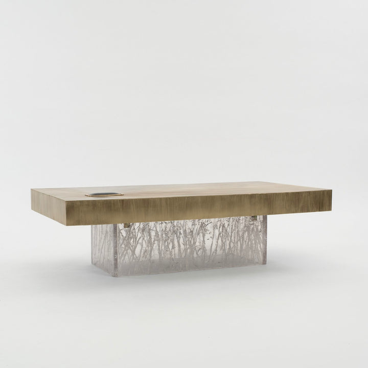 Hand-etched, French inspired Guilloche pattern brass table supported by a smoke-colored ice-cracked resin base and parchment gem by Sylvan San Francisco.