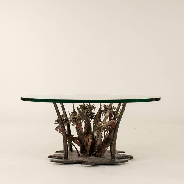 A rare brutalist coffee table by Silas Seandel, signed, circa early 1970s. From his "Woodland Series" of tables and furniture that portrayed natural forms. Featuring intricate torch-cut metal work, this table showcases the artist’s propensity for juxtaposing the tender (in subject - flora) with the hardened (in material - iron). Seandel’s iron flora grow out of a thick base which is rare for his designs. With original round 36" diameter glass top.