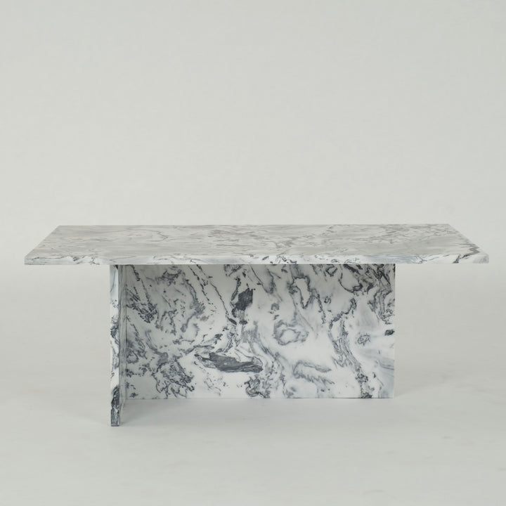 This modern cocktail table boasts a striking design featuring a single marble slab top supported by a T-shaped base.