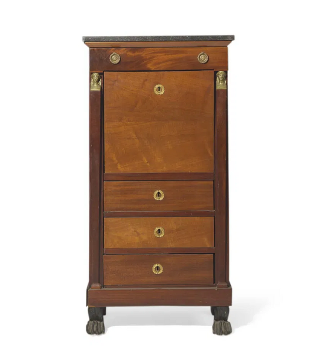 Mahogany Bureau de Secrétaire, gilt bronze ormolu and interior knobs, drop down leather tableau, 4 exterior drawers, 6 interior drawers with marble top.