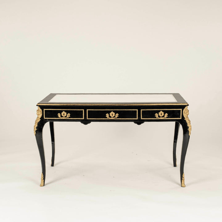 Black lacquer finish, brass ormolu and hardware, white leather top with gilded embossing.